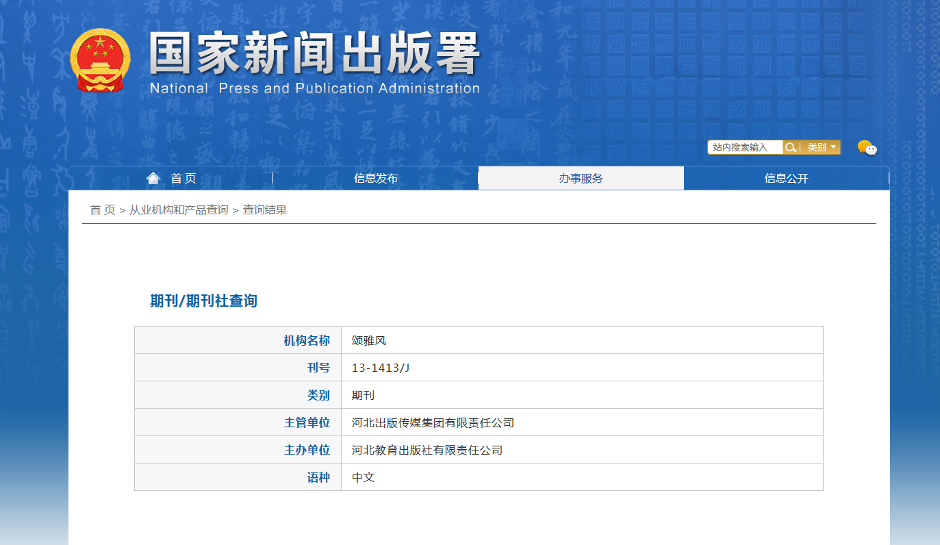 《颂雅风》杂志(国内连续出版物号:CN13-1413/J;国际标准连续出版物号:ISSN2095-3208)是由河北出版传媒集团主管,河北教育出版社主办的一本艺术教育研究、艺术作品探索与欣赏的专业期刊。栏目:大众艺术 百家争鸣 学术理论 文化纵横 教育在线 艺术与设计 杂谈来稿要求:1.稿件应具有科学性、先进性和实用性,论点鲜明、论据充分、数据真实、逻辑严谨、文字准确、语句通顺。2.文章标题字数在20字以内;摘要、关键词、参考文献(按引用的先后顺序)等要素一般要齐全。3.稿件请使用word格式,并注明作者姓名、联系电话、工作单位、通讯地址、邮编、电子邮箱。4.计量单位以国家法定计量单位为准;统计学符号须按国家标准《统计学名词及符号》的规定书写;标点符号使用准确;表格设计合理,推荐使用三线表;图片清晰,注明图号。5.本刊有权对所有来稿进行编辑;严禁一稿多投、剽窃或抄袭行为...详细